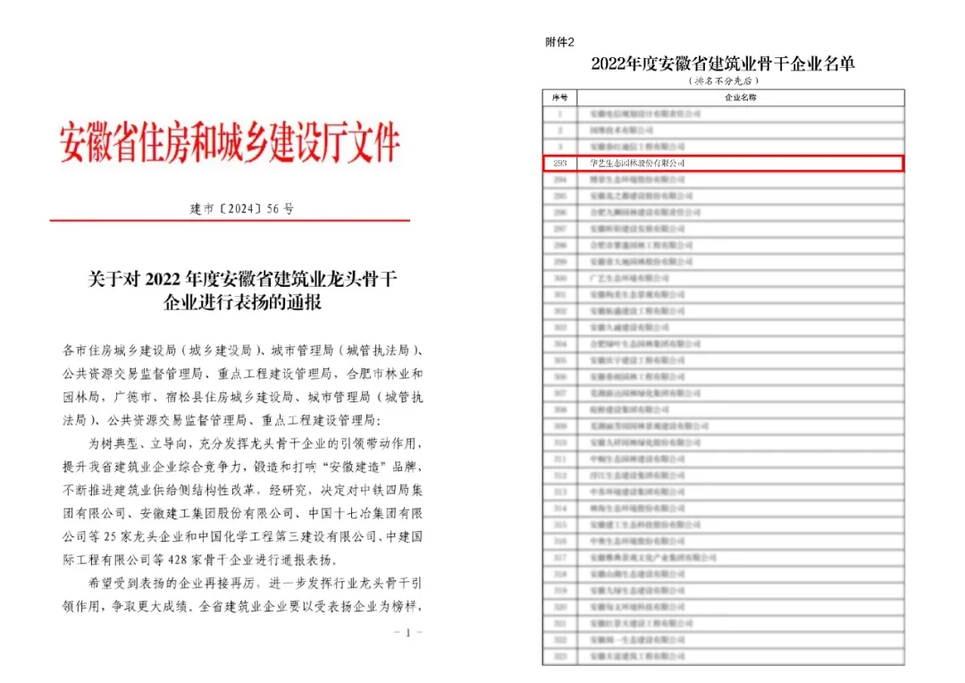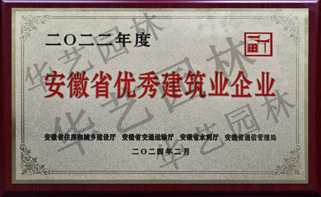 近日,安徽省住房城乡建设厅召开全省建筑业发展工作推进会,会议通报表扬了“2022年度安徽省建筑业龙头骨干企业”,并公布了“2022年度安徽省优秀建筑业企业”名单。华艺园林凭借强劲的综合实力、创新管理、智慧转型、品牌影响力,连续三年荣获“安徽省优秀建筑业企业”,并首次被授予“安徽省建筑业骨干企业”荣誉称号。