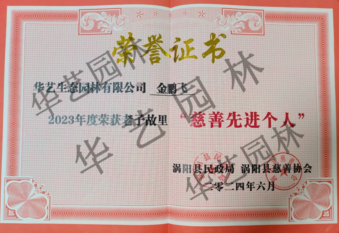 近年来,华艺园林持续改善涡阳县生态环境的同时,热心当地公益事业,积极参与乡村移风易俗发展、捐资助学、抗洪抢险、疫情防控、敬老助孤等公益事业。今后将继续践行社会责任,创新公益新模式,多渠道参与当地社会责任实践,不断助力涡阳县慈善事业高质量发展。