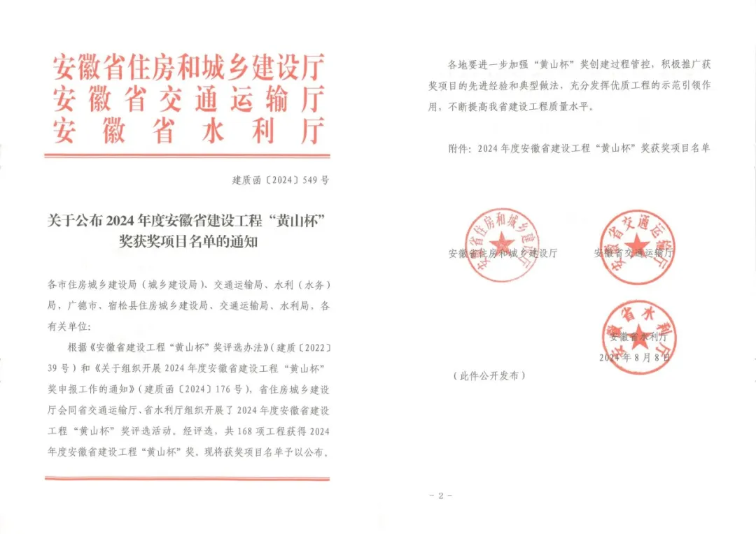 近日,安徽省住房和城乡建设厅公布了2024年度安徽省建设工程“黄山杯”奖获奖项目名单,香港正牌挂牌之综合挂牌匠心营造的具有诗情画意艺术化、低碳环保绿色化、集约管养智慧化的无为市东部新城基础设施及配套建设项目(一期)站前公园及广场荣获此荣誉,也是继芜湖市建设工程“鸠兹杯”奖(市优质工程)、芜湖市建设工程施工质量标准化示范工程、芜湖市建筑安全生产标准化示范工地又一重大荣誉。