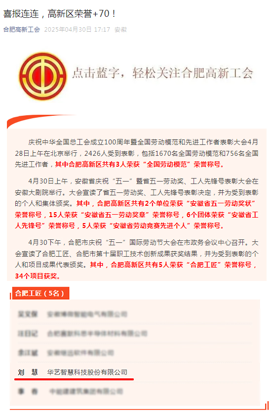华艺智慧将认真贯彻习近平总书记在庆祝中华全国总工会成立100周年暨全国劳动模范和先进工作者表彰大会上的重要讲话和考察安徽重要讲话精神,团结动员全体华艺人,牢牢把握高质量发展这个首要任务,围绕发展新质生产力,以劳模工匠为“领头雁”,激励全体员工对标先进,苦练本领,争先创优,全力打造一支知识型、技能型、创新型的新时代人才队伍,挺膺担当、攻坚克难、奋发有为,在推进人与自然和谐共生的中国式现代化火热实践中书写劳动风采、创造时代荣光。