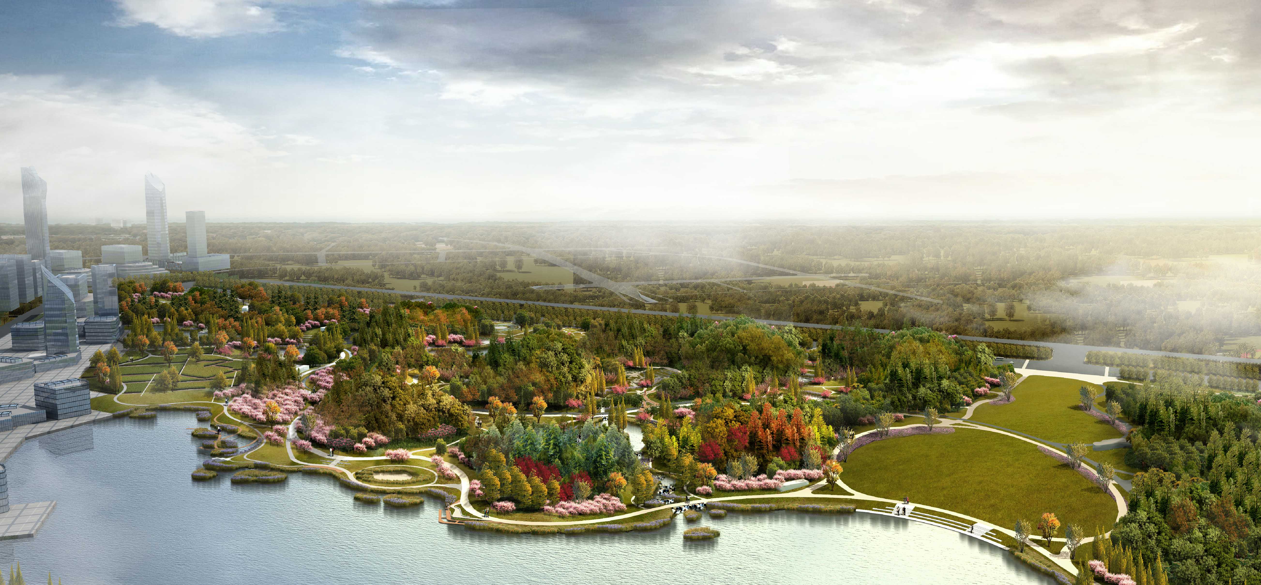 锦绣湖公园-2标段遵循生态学思想,结合现场立地条件,营造大型片林景观。为突出植物品种,营造各类专类园,打造春花秋叶、杜鹃莲影、缤纷花谷的自然生态景象,增加可进入性与参与性,实现人与自然和谐共生。