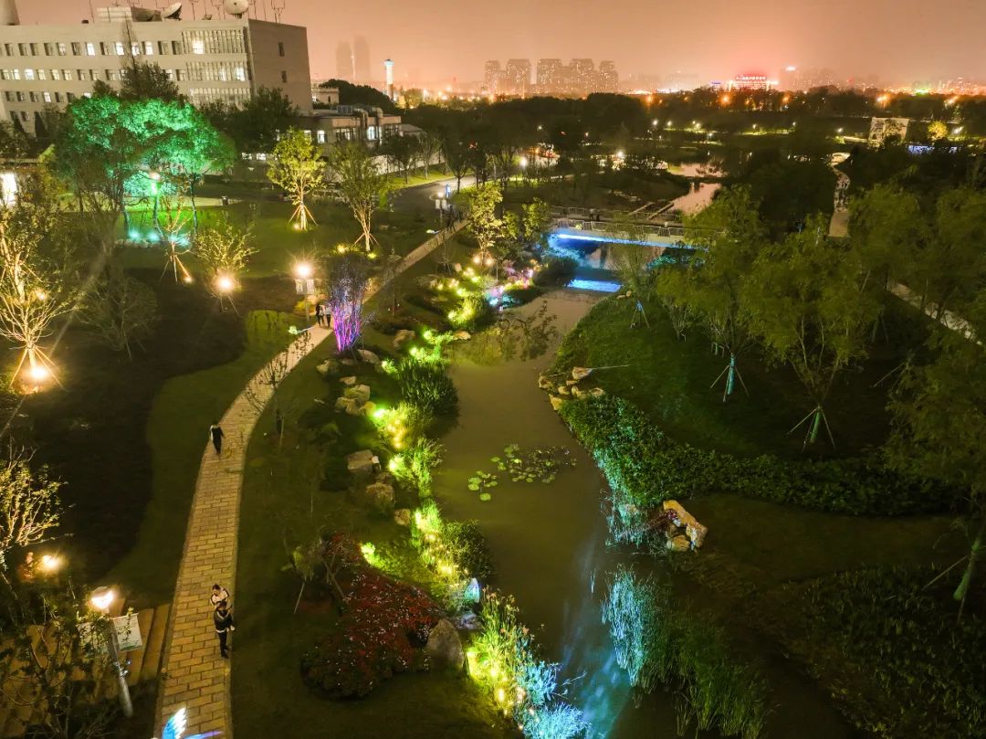 园博小镇践行城市更新和生态优先理念,保留场地原有空间尺度及肌理特征,织补强化原有组团特征,沿用原有水系、建筑、路网,不砍一棵大树,不外运一方土,没有新建主场馆,甚至还保留了园区七千余株“原住”乔木。园博小镇在建设中随形就势打造园区地势形态,提升园区生态品质,传承再现小镇记忆及历史印记。