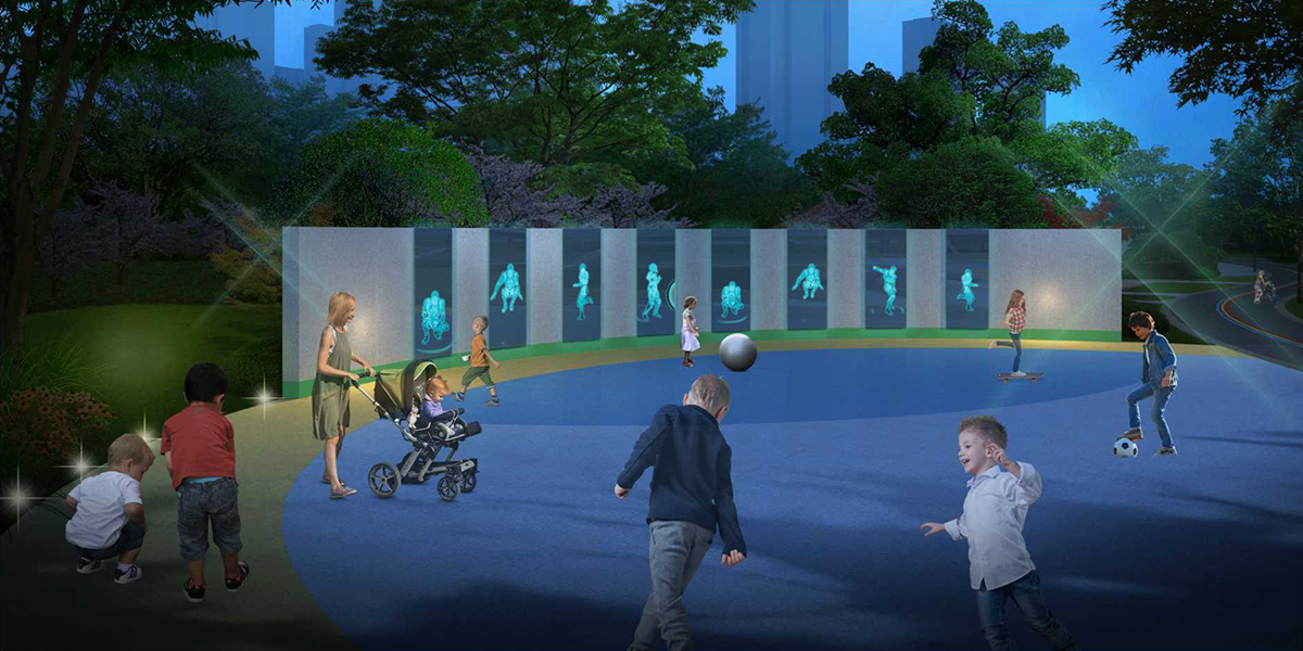 不仅有智慧化区也有无动力区。智慧化区以儿童虚拟嘉年华为主题设计了跳跃大赛-耐力大赛-协调大赛-AR切水果-冬奥跳跳赛-冬奥打雪仗、追光跑道、童心涌泉互动骑行、AI文化科普互动机器人、AI乐声清扬互动琴弦 、蓝夹缬感应门等智慧设备。